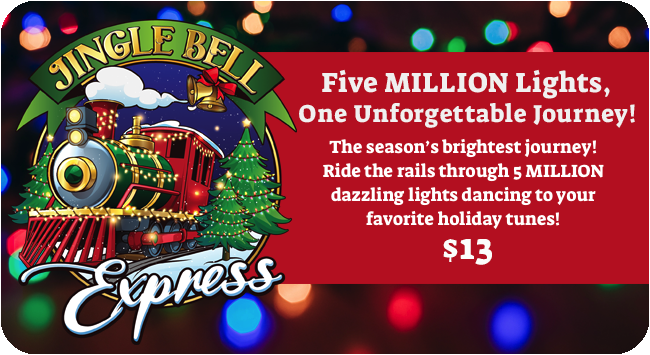 Make magical Christmas memories at Dewberry Farm and SAVE in our year’s biggest sale! For a limited time, save up to 40% on Christmas ‘Flex’ Tickets, good any day, any time we are open for Christmas! Cozy up on a hay wagon with hot chocolate, toss REAL snowballs, meet Santa, and embark on the season’s brightest journey aboard the Jingle Bell Express— a train ride through a mile-long wonderland of 5 MILLION Christmas lights! Children 2 and under are FREE. Parking is FREE.